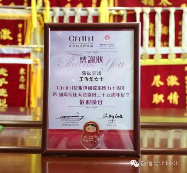 2016年6月14—16日,CMM蒙妮坦國(guó)際集團(tuán)五十周年暨國(guó)際斯佳美容協(xié)會(huì)三十五周年答謝晚宴在香港灣仔會(huì)議展覽中心Grand Hall隆重舉行。作為美業(yè)異軍突出的盛世集團(tuán)應(yīng)邀出席,盛世集團(tuán)董事長(zhǎng)王俊華女士與盛世首席營(yíng)銷(xiāo)總策劃Sophie老師一同前往香港,參加這次美業(yè)的盛典,行業(yè)大伽齊聚一堂,盛世集團(tuán)又獲得了多項(xiàng)殊榮。祝愿CMM蒙妮坦國(guó)際集團(tuán)的事業(yè)更進(jìn)一步,再創(chuàng)輝煌!